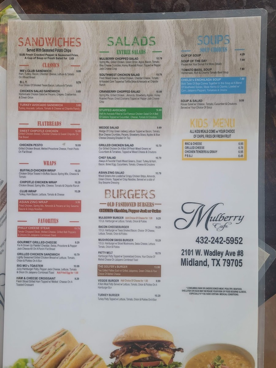 Welcome to Mulberry Cafe, a hidden gem in Midland, TX, where comfort meets taste. Nestled at 2101 W Wadley Ave, this cafe delivers a delightful array of dishes perfect for breakfast or lunch. The moment you step inside, you're greeted with a warm ambiance that invites you to linger.